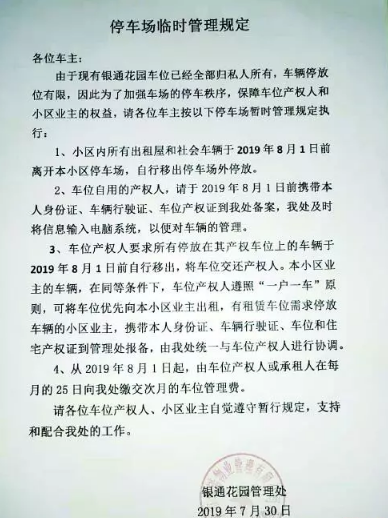 7月30日,剛進(jìn)駐不到半個(gè)月的新物業(yè)公司華諾物業(yè)貼出通知,表示目前小區(qū)車(chē)位已全部歸私人所有,稱產(chǎn)權(quán)車(chē)位優(yōu)先向小區(qū)業(yè)主出租,并附有產(chǎn)權(quán)人車(chē)位出租報(bào)備一覽表。表中注明大多數(shù)的產(chǎn)權(quán)車(chē)位月租為900元至1050元(當(dāng)中包含150元的車(chē)位物業(yè)管理費(fèi)),并從8月1號(hào)開(kāi)始執(zhí)行。“最開(kāi)始小區(qū)車(chē)位收費(fèi)是兩三百塊錢(qián)一個(gè)月,后來(lái)慢慢升到500元,但這次通知一出來(lái)立刻漲了500多塊。”晉先生稱,很多車(chē)主不滿這次停車(chē)費(fèi)突漲一倍多。但更令他們不解的是,原以為仍屬于開(kāi)發(fā)商的產(chǎn)權(quán)車(chē)位,原來(lái)已拍賣(mài)給了個(gè)人。